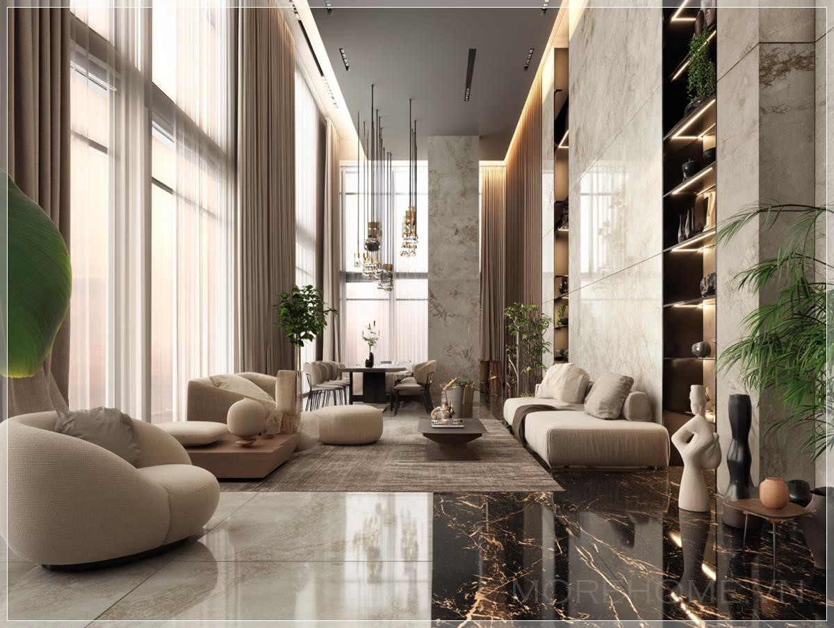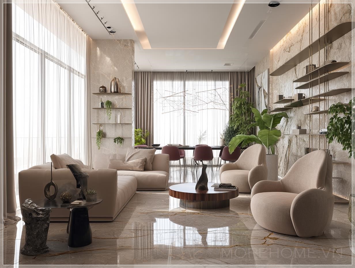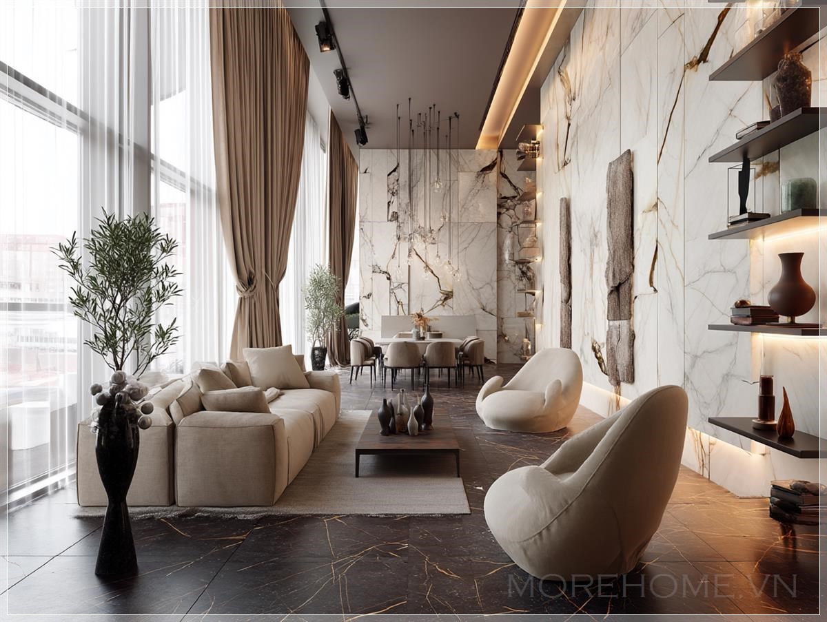 Phòng khách hiện đại sang trọng, trần cao với ánh sáng nền strip, tường đá marble với đèn LED tích hợp, sàn đá marble đen bóng với vân vàng, ghế bành màu be mềm mại với hình dạng bo tròn, sofa màu be đương đại, trang trí hiện đại trừu tượng, rèm cửa lớn che phủ cửa sổ cao, bàn cà phê gỗ trung tâm với bình hoa và tượng nghệ thuật, khu vực ăn ở phía sau với ghế nhung và đèn treo, ánh sáng ấm áp và huyền bí, cây cảnh trong nhà làm điểm nhấn tự nhiên, kệ trang trí hiện đại với các vật phẩm trang trí, không gian nội thất thanh lịch và tinh tế, render điện ảnh, siêu thực, ánh sáng hoàng hôn buổi tối chiếu qua rèm cửa, bố cục đối xứng.