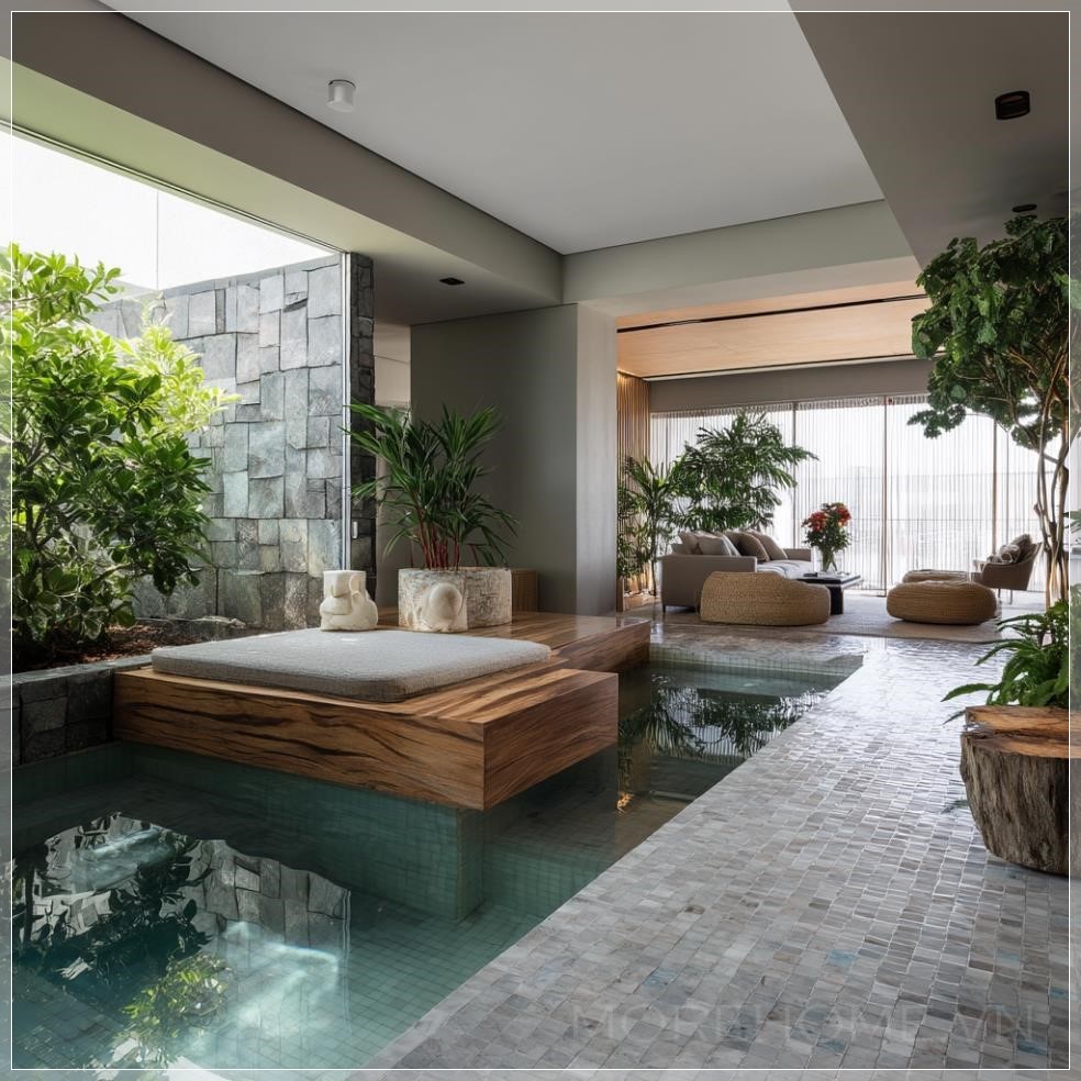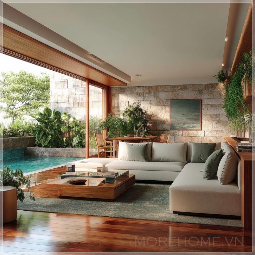 Phòng khách hiện đại, sàn lát gạch hidráulico với màu sắc sáng, vật liệu tự nhiên và sự kết hợp hài hòa với khu vườn và hồ bơi.