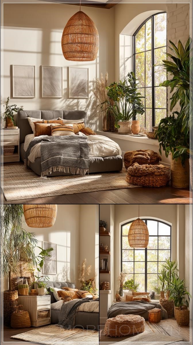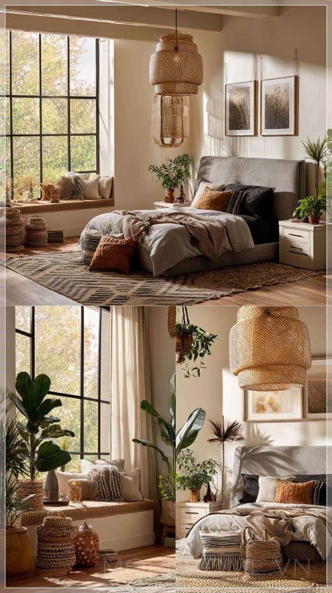 Thiết kế nội thất phòng ngủ với ba bức tranh treo tường phía trên giường, giường bọc nệm màu xám thoải mái và một chiếc bàn cạnh giường trắng ở mỗi bên. Không gian được trang trí với nhiều cây xanh tươi tốt để tạo nên bầu không khí phong cách bohemian. Bao gồm hai chiếc đèn pendant mây treo trên các bàn cạnh giường để chiếu sáng mềm mại, ấm áp. Ánh sáng tự nhiên từ cửa sổ lớn chiếu vào, tạo ra không gian yên bình và ấm cúng. Nổi bật những chi tiết tinh xảo như vải dệt nhiều lớp, giấy dán tường có kết cấu, và các món đồ trang trí thủ công.