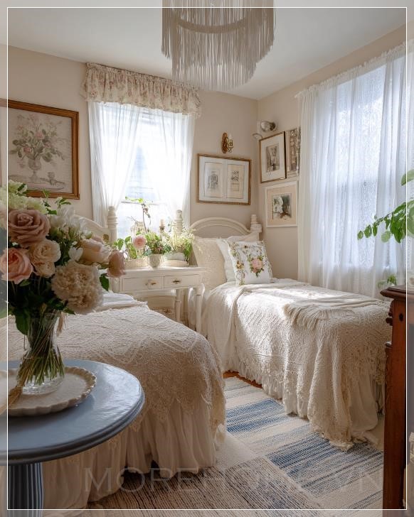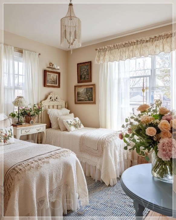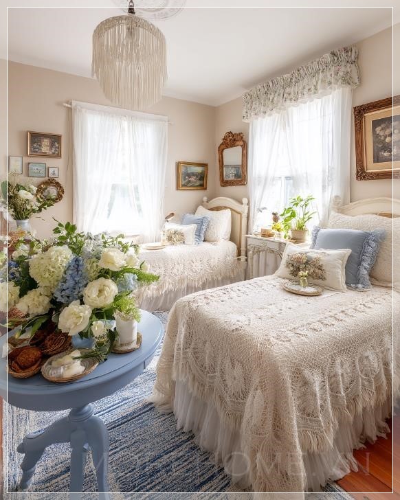 Phòng ngủ đôi cổ điển với những chiếc giường kiểu Pháp màu kem trang trí tinh xảo, gối thêu hoa, bộ chăn ga bằng vải ren và đan trắng, tường màu be nhẹ nhàng, rèm sheer trắng tỏa sáng ánh sáng tự nhiên, tác phẩm nghệ thuật cổ điển trong khung tranh treo trên tường, rèm hoa trang trí phía trên cửa sổ, đèn chùm với tua tua tinh tế, bàn tròn màu xanh với chân váy xếp, đặt một bó hoa tươi lớn, thảm dệt sọc xanh, phong cách cottagecore, không gian ấm áp, thoải mái, với nét quyến rũ cổ điển lãng mạn, siêu thực.