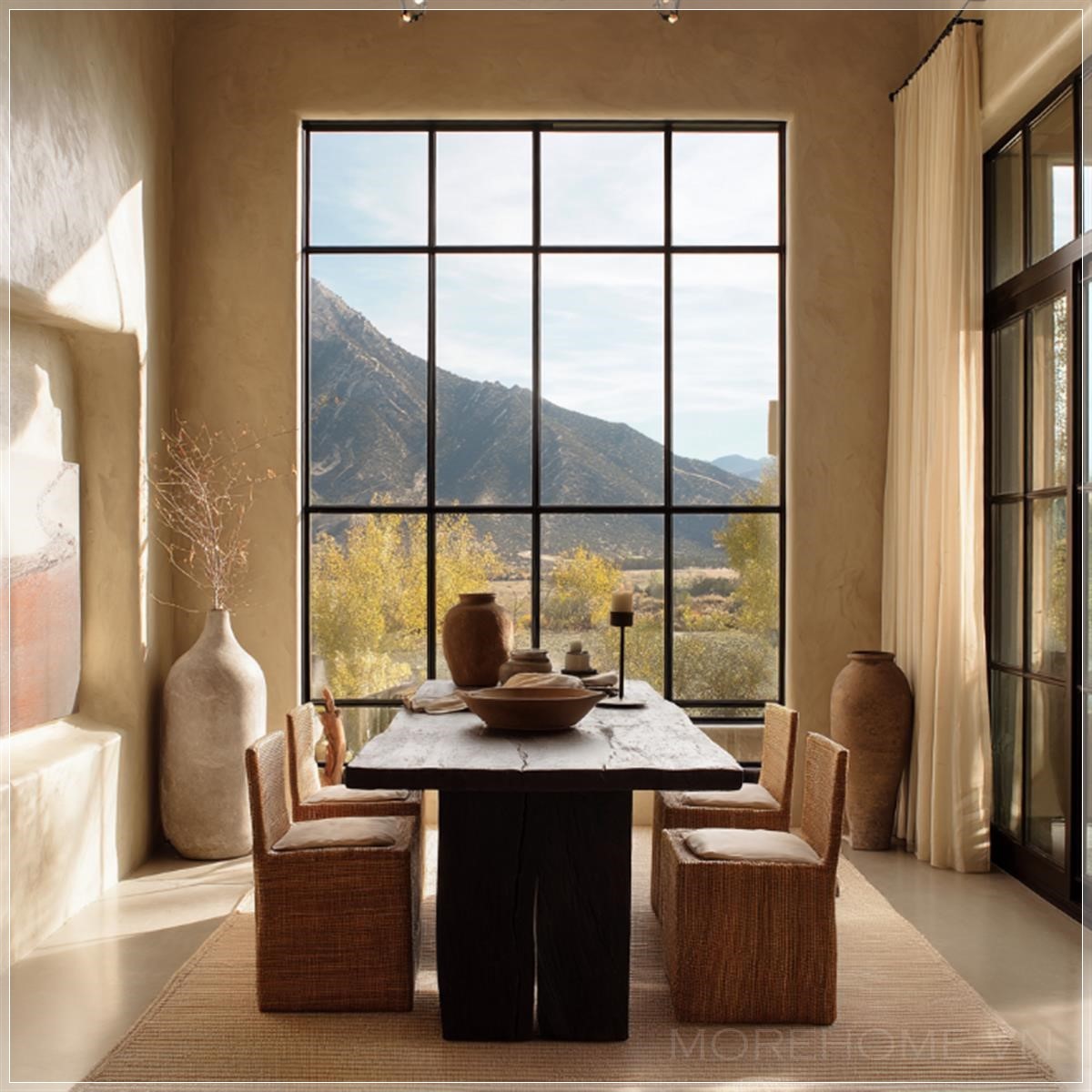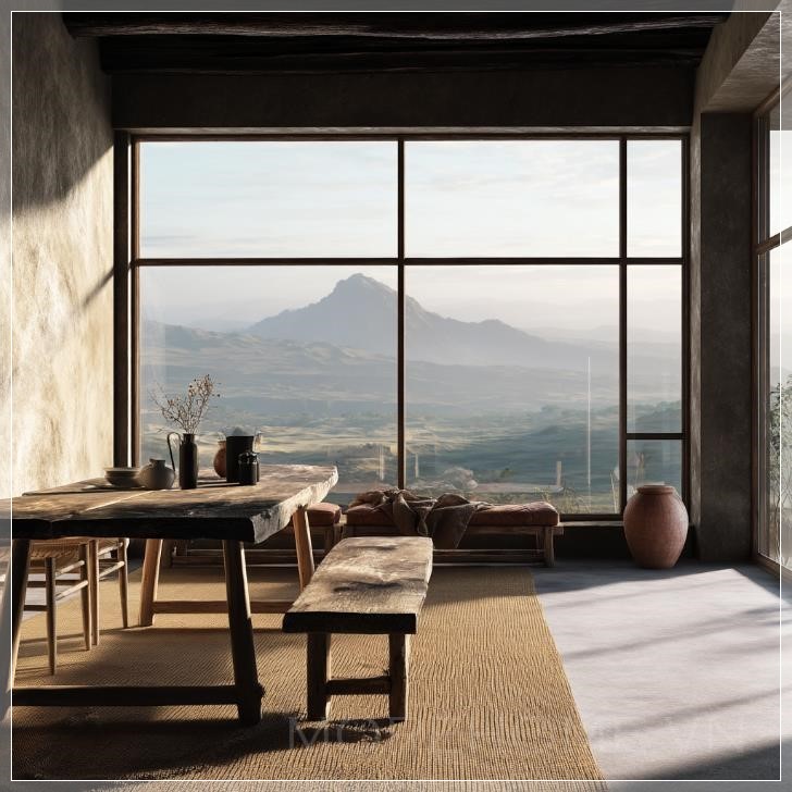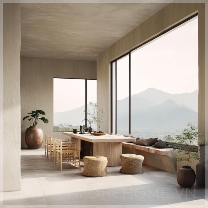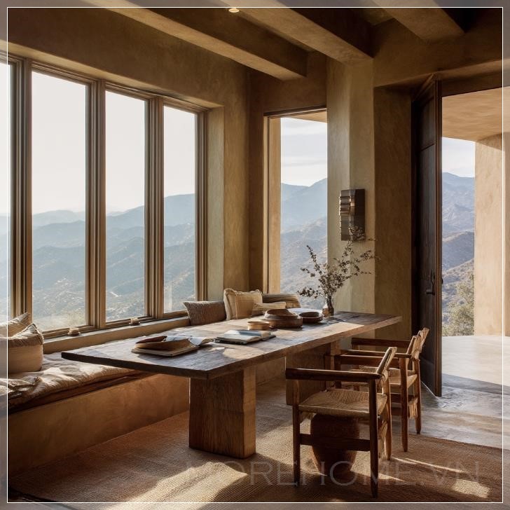 Phòng ăn ngồi theo phong cách wabi sabi chân thực, không có tác phẩm nghệ thuật trên tường. Các vật liệu tự nhiên được sử dụng cho nội thất. Cửa sổ lớn mở ra khung cảnh núi non hùng vĩ. Chụp ảnh độ phân giải cao, phong cách tạp chí chuyên nghiệp.