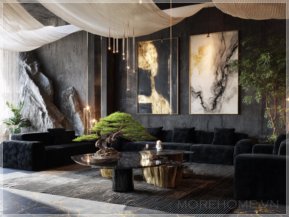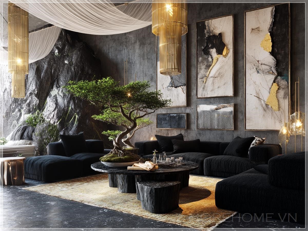 Phòng khách 8 mét x 8 mét với ghế sofa boucle đen hiện đại, sàn đá cẩm thạch đen và vàng, bàn cà phê gỗ gốc cây nhuộm đen, tường bê tông thô với các tác phẩm nghệ thuật màu đen, trắng và vàng, vải lụa trắng mượt treo từ trần theo hình sóng, cây bonsai trên bàn cà phê.
