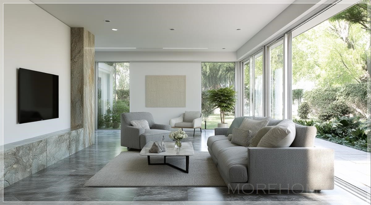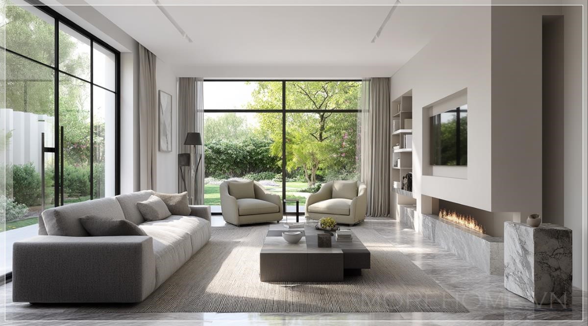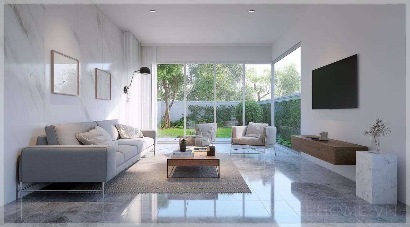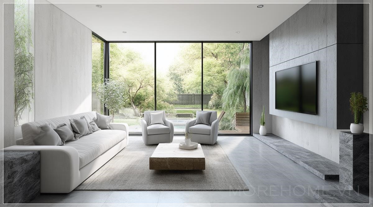 Phòng khách với nội thất hiện đại, sàn đá cẩm thạch màu xám và tường trắng, cửa sổ lớn nhìn ra vườn, một chiếc ghế sofa vải màu xám nhạt kèm theo hai ghế bành, và TV được treo trên tường. Một bệ đá để tác phẩm nghệ thuật được đặt gần bàn cà phê. Thiết kế nội thất của ngôi nhà theo phong cách tối giản.