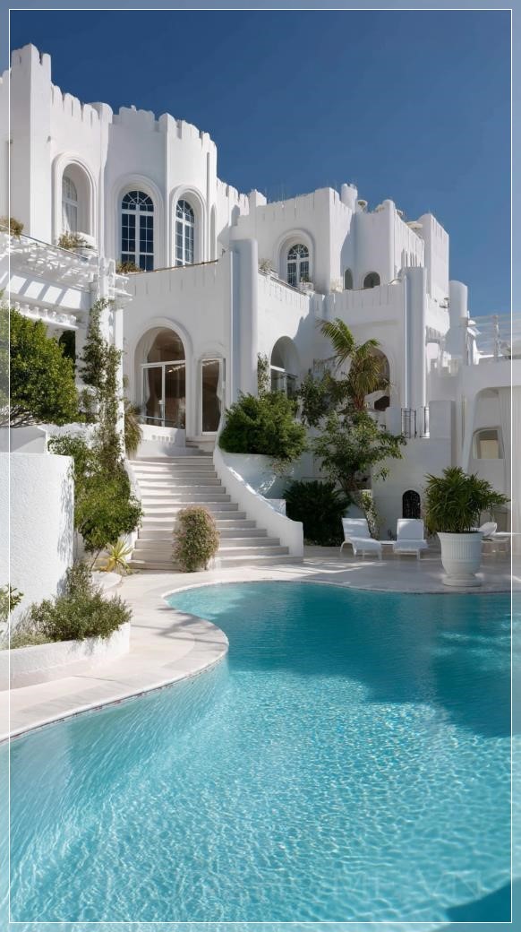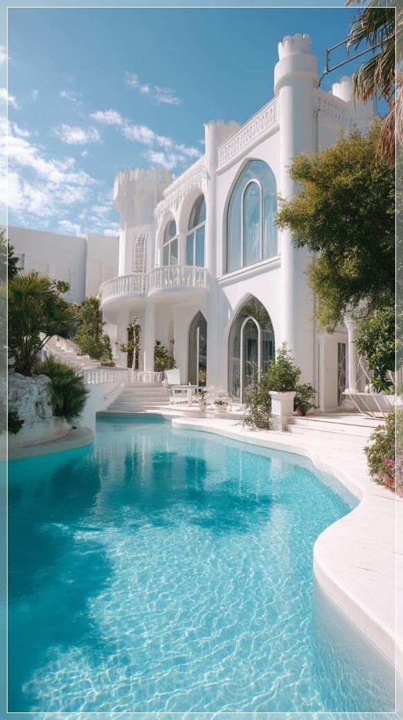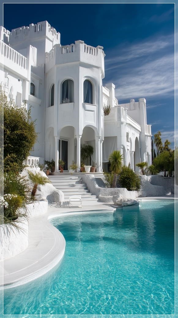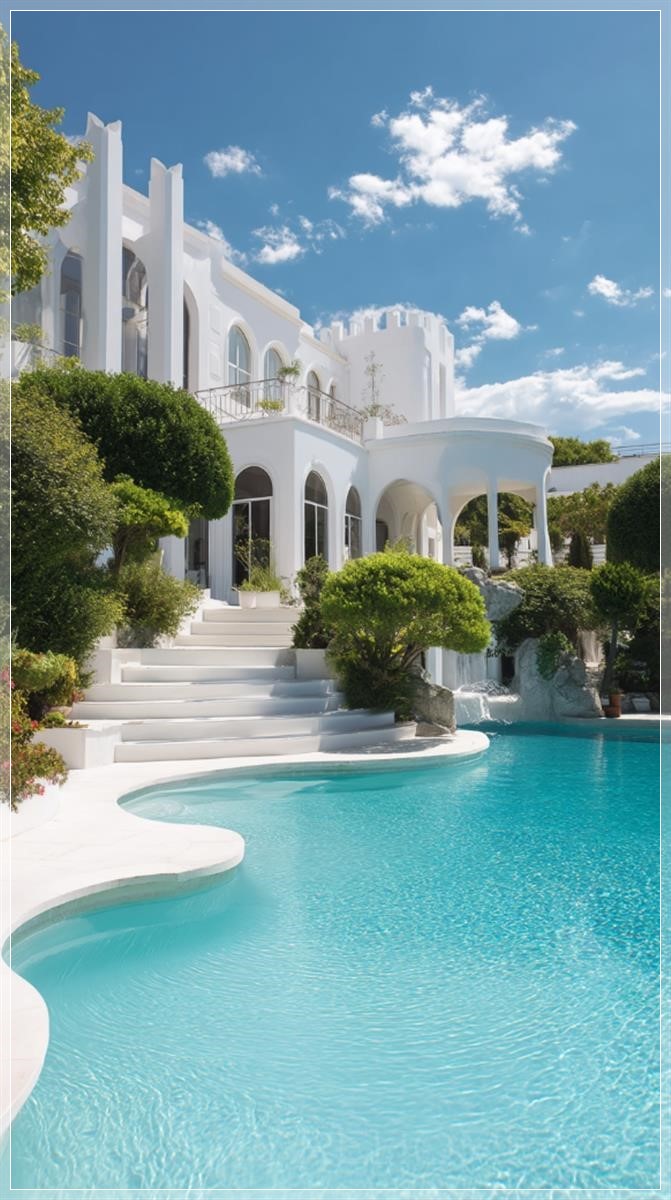 Biệt thự trắng sang trọng theo phong cách Địa Trung Hải. Những cửa sổ vòm nguy nga, các cột trụ thanh lịch và những tháp nhỏ tạo nên vẻ uy nghi cho căn biệt thự. Phía trước ngôi nhà là một hồ bơi rộng lớn với hình dáng bất đều, nước trong vắt màu xanh biếc, xung quanh được bao bọc bởi cây xanh tươi tốt và các loại cây cảnh được chăm sóc kỹ lưỡng. Những bậc thềm và sân thượng màu trắng tinh khôi hòa quyện hoàn hảo vào cảnh quan, tạo nên bầu không khí thanh lịch và yên bình. Một ngày nắng rực rỡ làm nổi bật sự tinh tế của các đường nét và sự nhẹ nhàng của kiến trúc, trong khi những đám mây mềm mại trên bầu trời xanh tạo ra một sắc thái đẹp mắt cho cảnh vật.