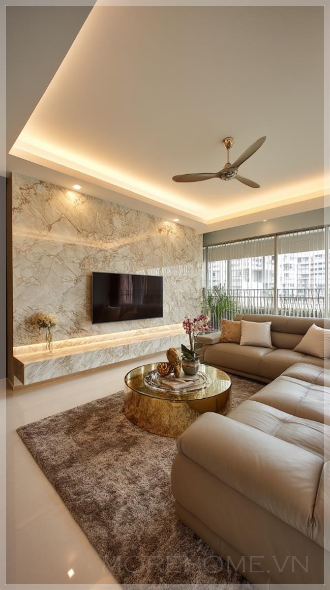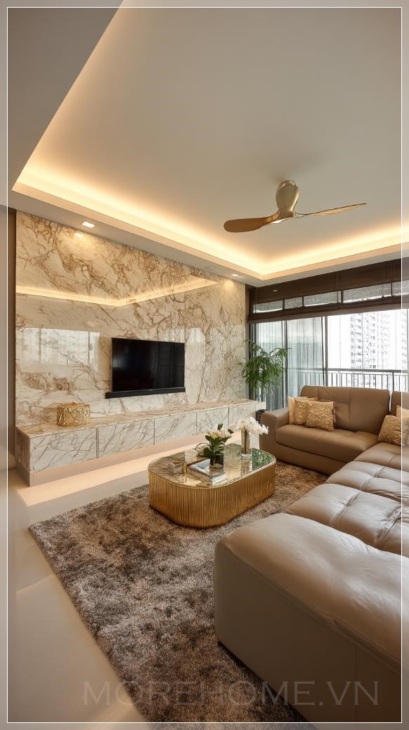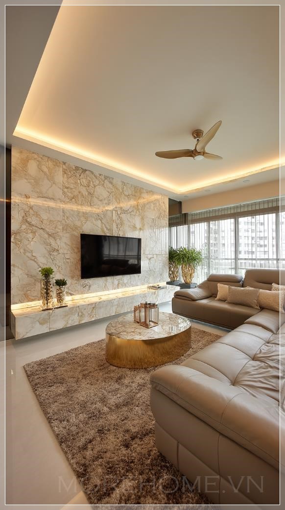 Phòng khách HDB Singapore, nội thất hiện đại sang trọng, tường TV nổi bật bằng đá marble lớn, đèn LED chiếu sáng nền, ghế sofa thiết kế thấp màu taupe, bàn cà phê kính và vàng, thảm có kết cấu, đèn trần tạo không gian ấm cúng, vẻ ngoài bóng bẩy và cao cấp.