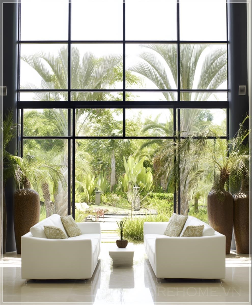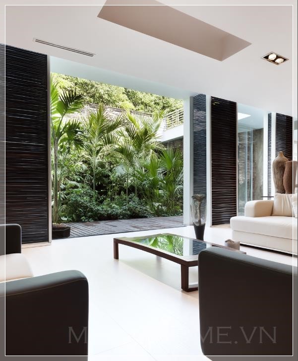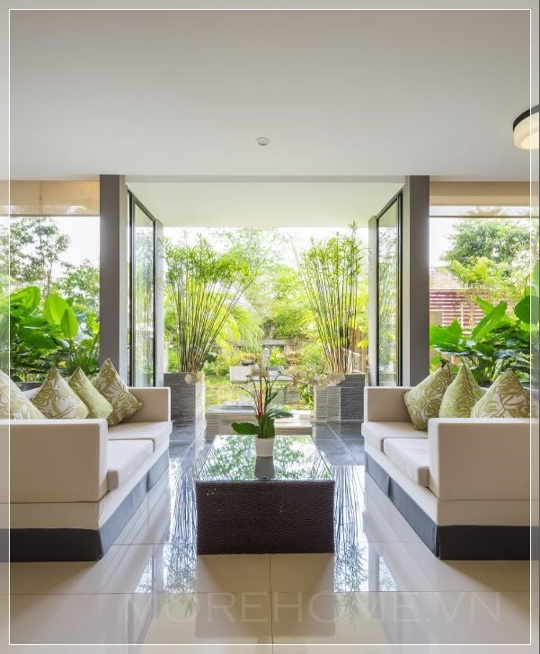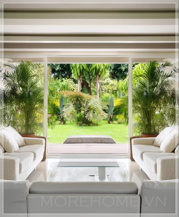 Cảnh quay phòng khách thiết kế hiện đại, khu vườn nhiệt đới phía sau qua cửa sổ, bố cục đối xứng. Liên hệ: https://zalo.me/morehomevietnam