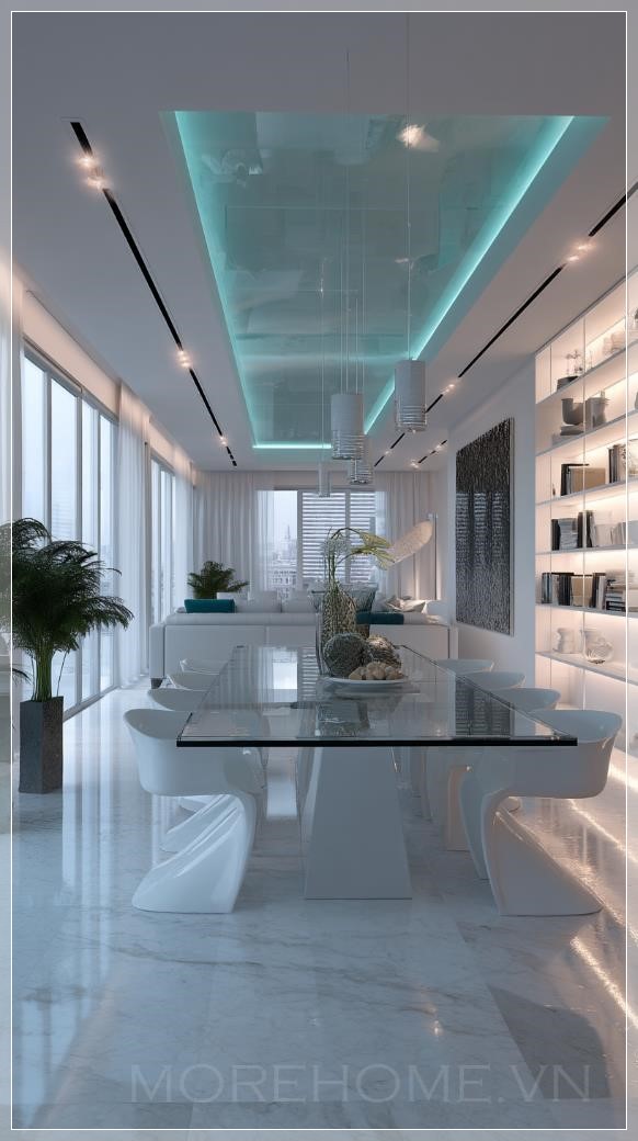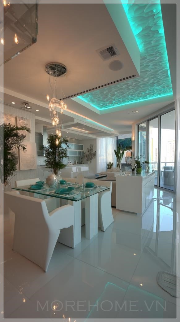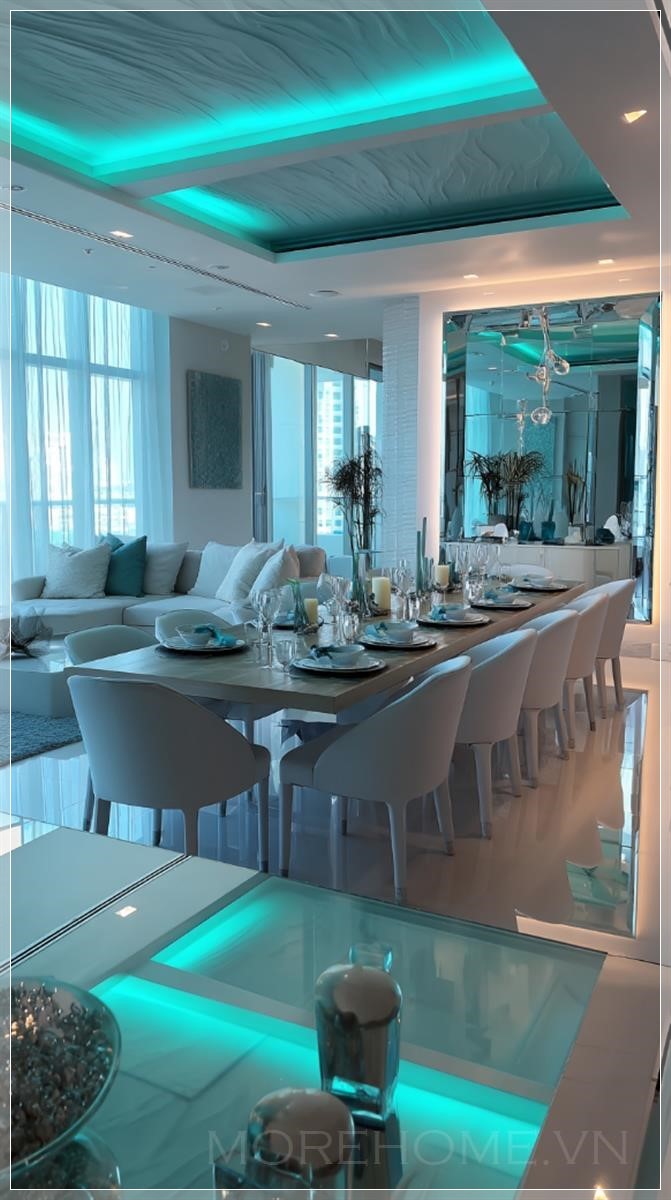 Nội thất phòng ăn penthouse hiện đại, hoàn toàn trắng, với ánh sáng LED màu xanh lam. Liên hệ: https://zalo.me/morehomevietnam