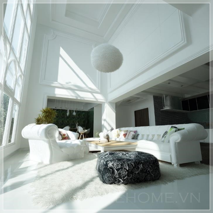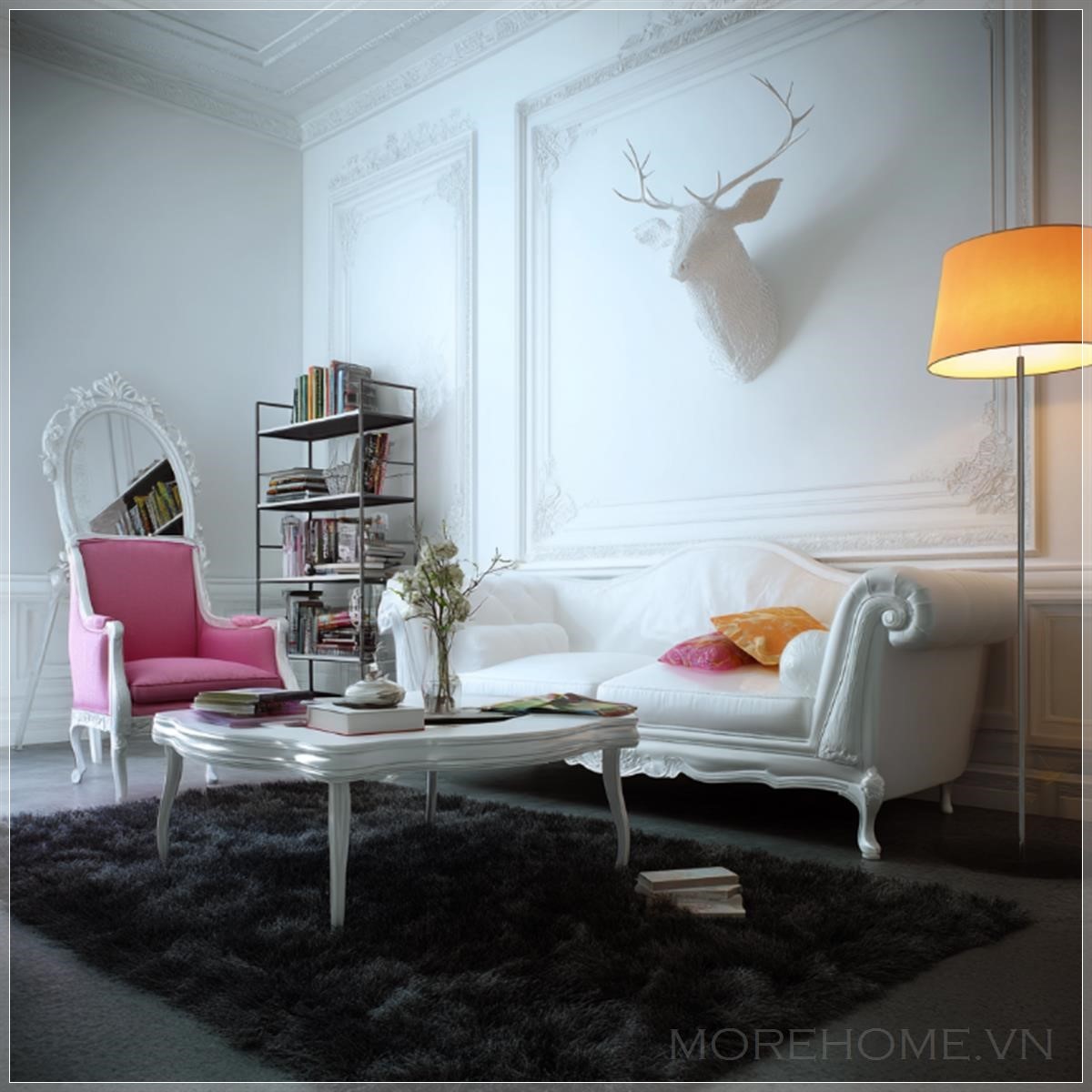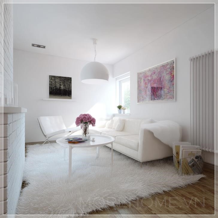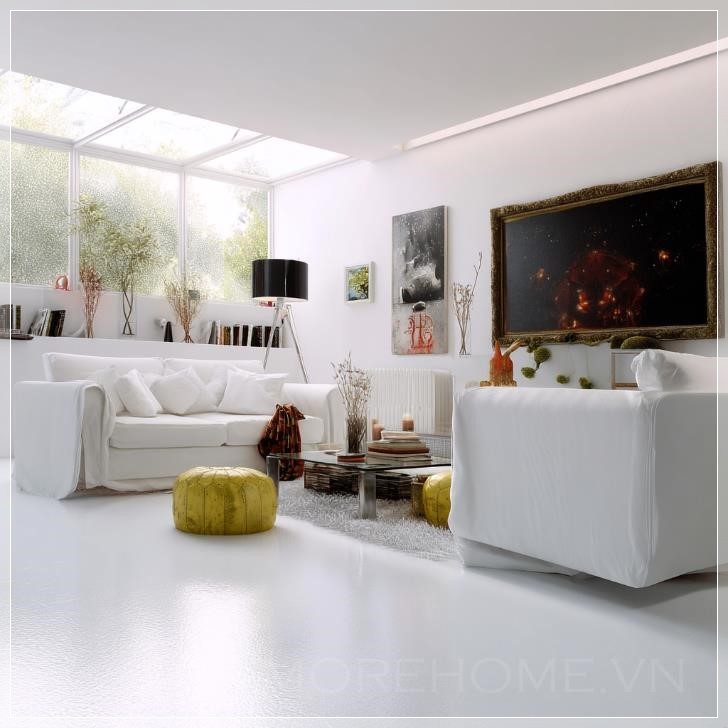Phòng khách trắng theo phong cách pop với không gian rộng mở, tường trắng sáng tạo cảm giác thoáng đãng. Nội thất hiện đại với sofa bọc vải trắng, những chiếc gối trang trí màu sắc nổi bật như đỏ, xanh dương và vàng. Một chiếc bàn cà phê thiết kế đơn giản, với khung kim loại mảnh, mặt bàn kính trong suốt. Ánh sáng tự nhiên tràn vào qua cửa sổ lớn, làm nổi bật sự tương phản giữa các mảng màu rực rỡ và nền trắng. Tranh nghệ thuật pop art sặc sỡ treo trên tường, mang đến điểm nhấn thú vị và trẻ trung cho không gian. Sàn gỗ sáng màu kết hợp với những chiếc đèn chùm trần hiện đại, tạo ra một không gian sống năng động và tươi mới.