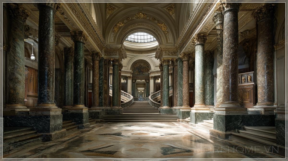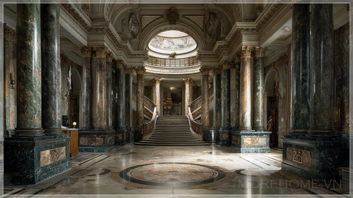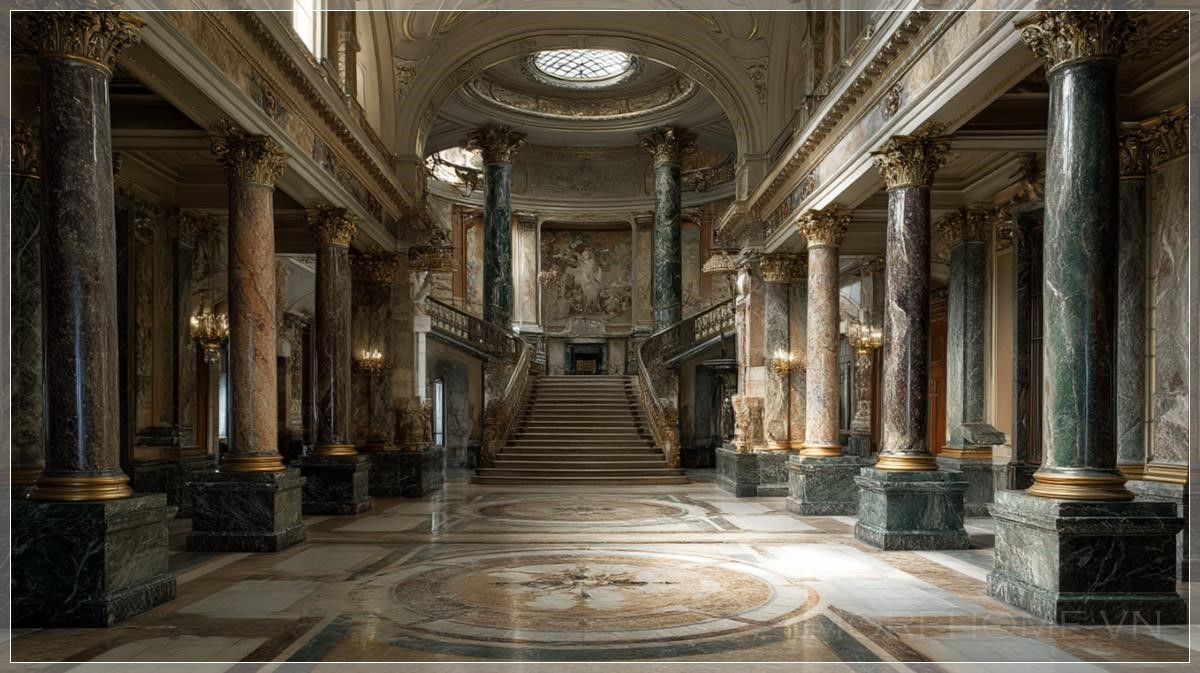 Những cột kiến trúc theo phong cách Corinth trắng tinh khôi đứng canh gác hai bên, tạo nên một hành lang uy nghi dẫn đến trung tâm của sảnh. Dưới chân, sàn nhà được lát bằng đá cẩm thạch trắng với những ánh hào quang bảy sắc, điểm xuyết bởi những họa tiết xoắn ốc bằng vàng tinh xảo. Mỗi bước chân đều như đang bước trên một tác phẩm nghệ thuật sống động.