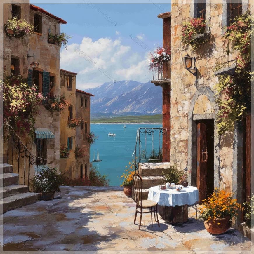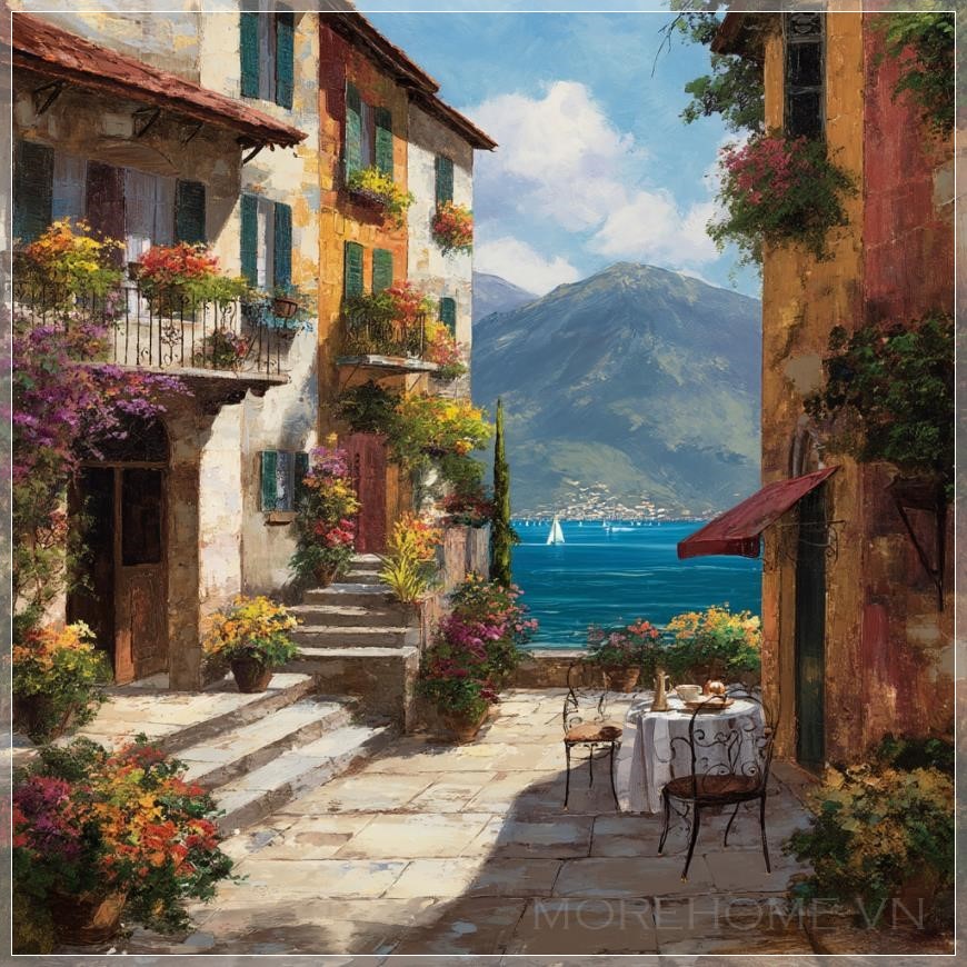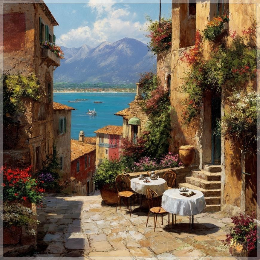 Trong một ngôi làng cổ kính của Ý, những con đường lát đá nhỏ nhắn uốn lượn qua các ngôi nhà màu sắc tươi sáng, mỗi bức tường được trang trí bằng những chậu hoa rực rỡ. Mỗi bước chân đều như dẫn dắt bạn vào một không gian thơ mộng, nơi mà vẻ đẹp của thiên nhiên hòa quyện với sự yên bình của cuộc sống làng quê. Tại một góc sân ngoài trời, một chiếc bàn nhỏ được bày biện cho một bữa trà chiều, với tách trà nghi ngút khói và bánh ngọt xinh xắn, tất cả đều hướng ra biển xanh mênh mông dưới bầu trời trong xanh, sáng lạn.